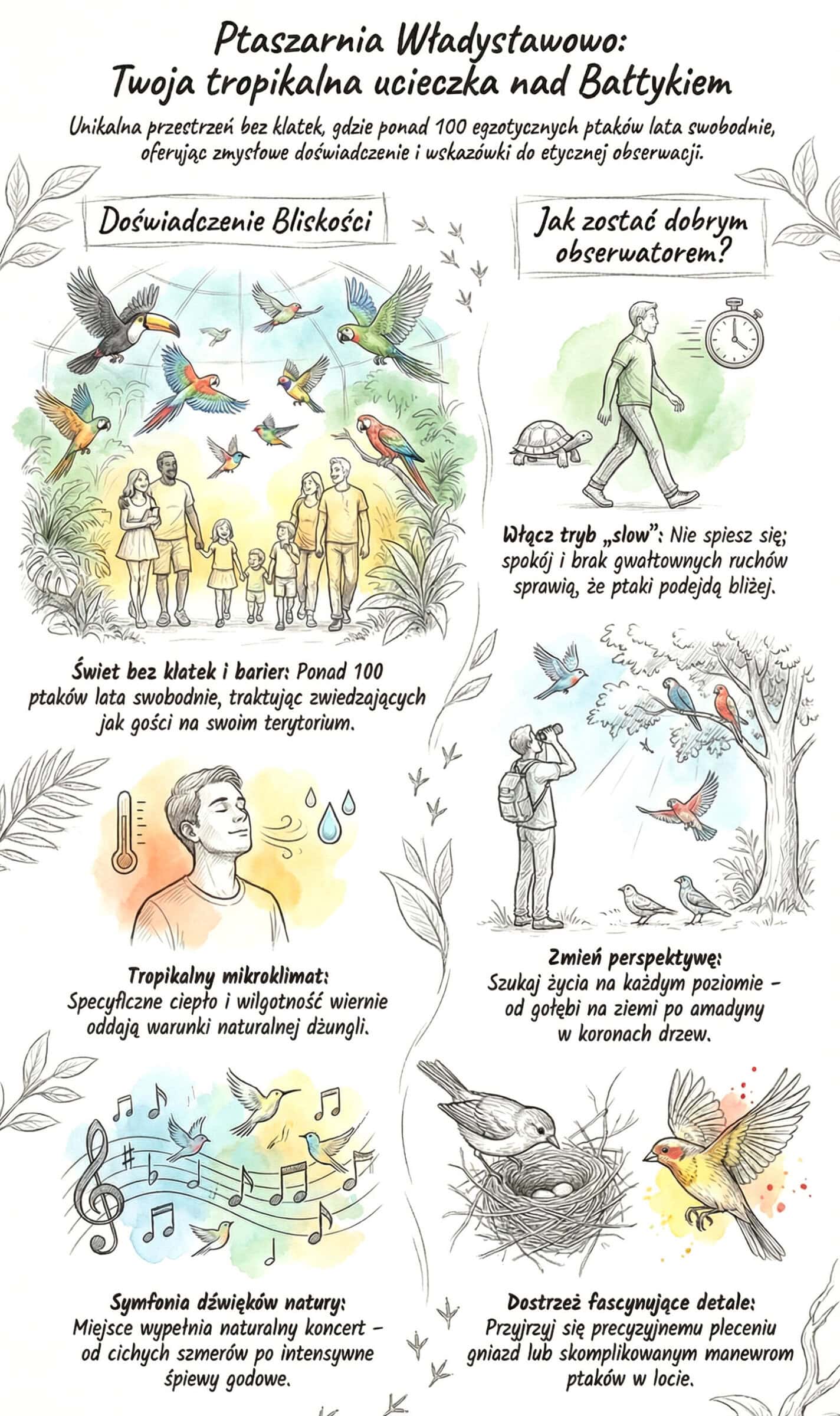 To doświadczenie, które angażuje wszystkie zmysły. Po pierwsze – ciepło i wilgotność. Utrzymujemy tu specyficzny mikroklimat, dzięki któremu nasze ptaki czują się jak w swoim naturalnym, egzotycznym środowisku.